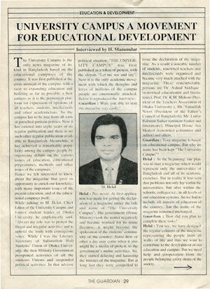 While talking to M Helal, Chief Editor of the University Campus and former student leader of Dhaka University, he emphatically said, "Always my role was to protest the illegal and irregular activities and to uphold the truth with courageous voice. While I was the Literary Secretary of Salimullah Hall Students' Union of Dhaka University, the then Military Government postponed activities of all the students unions and suspended political acitivities. In that adverse political situation, "The University Campus" was first published as a token of protest, with the slogan, "Let me see and say". Now it is the only academic movement with which the thoughts and loves of millions of the campus people are emotionally attached. Below is reproduced the interview.